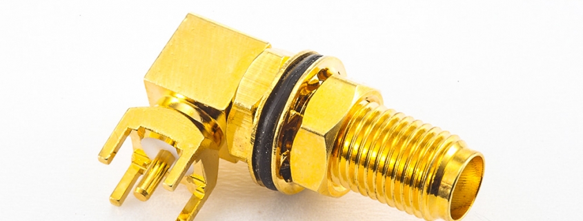防水射频连接器SMA型母头弯式PCB安装插孔前锁穿墙
